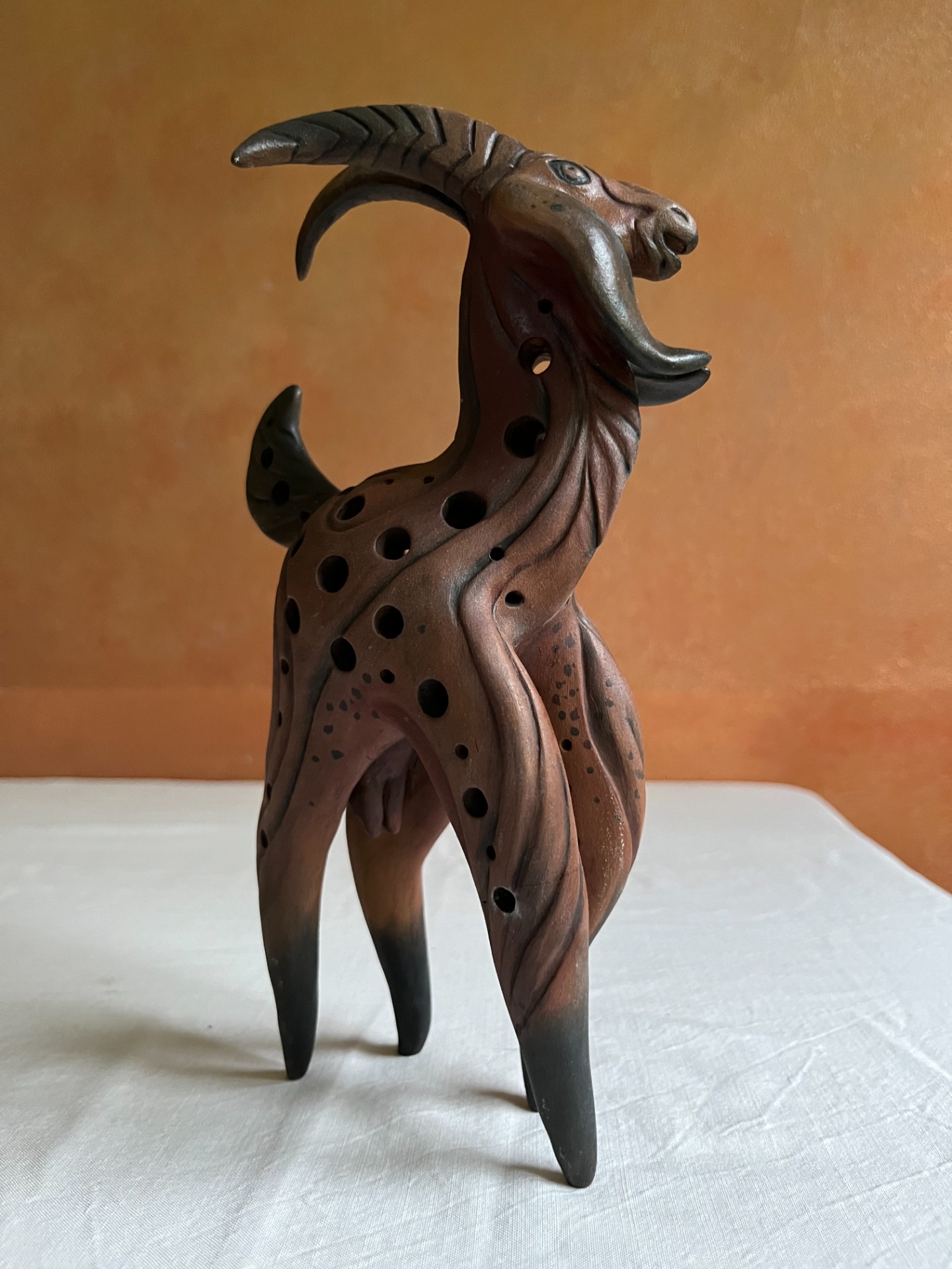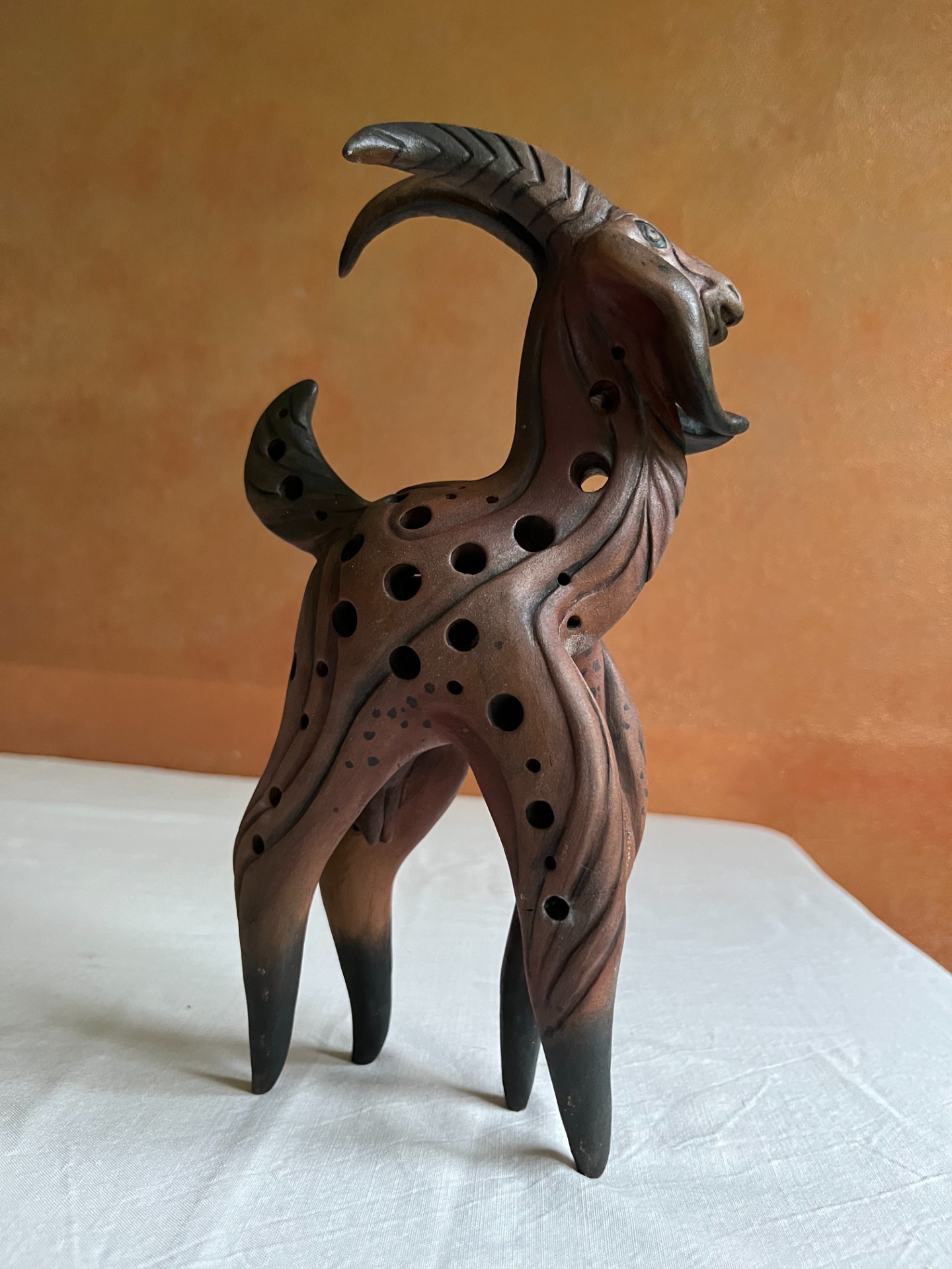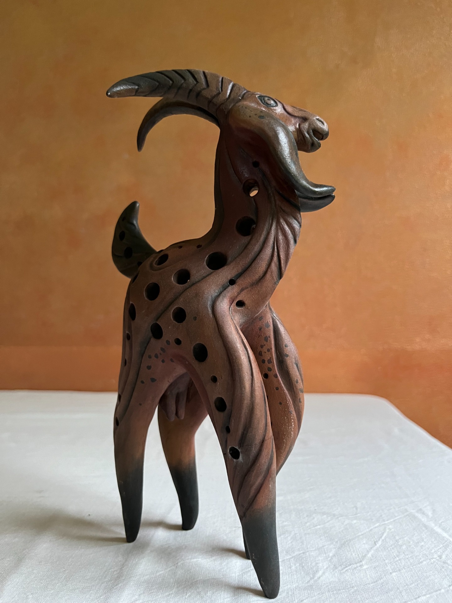 Stylizovaná soška anglonubijské kozy z burelové hlíny. Patinovaná oxidy s lehce poťouchlým výrazem. Pro milovníky kozích bytostí. Výška-20cm