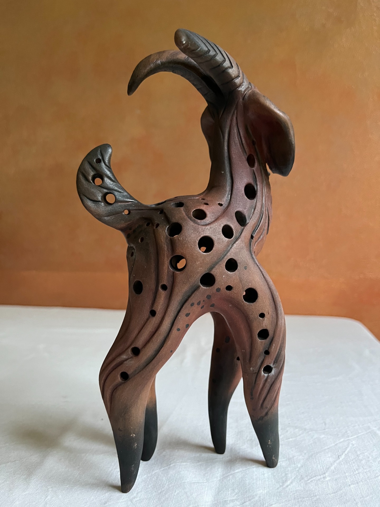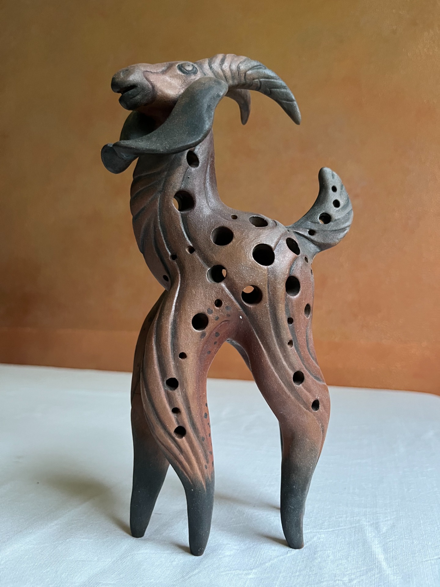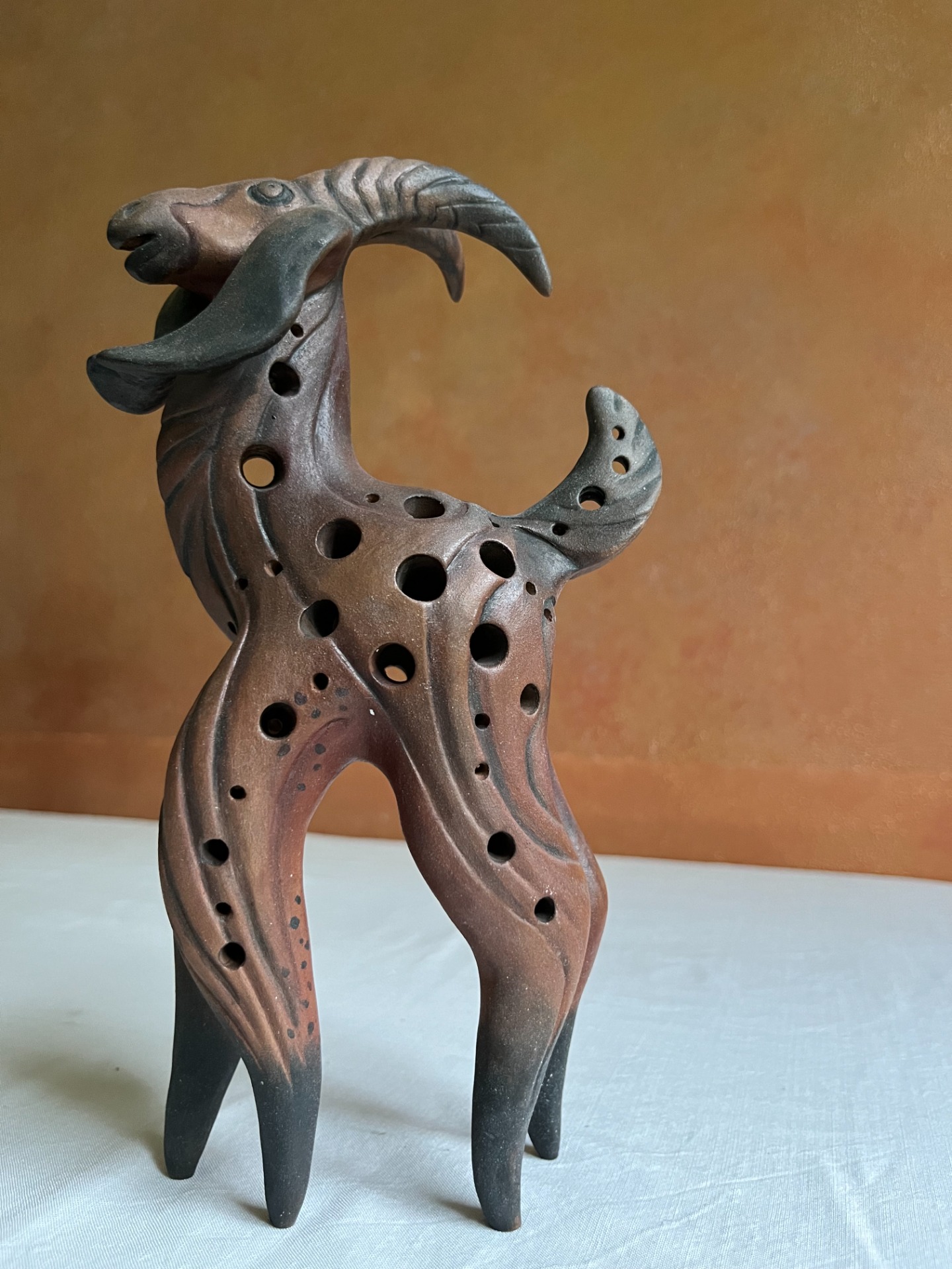 Stylizovaná soška anglonubijské kozy z burelové hlíny. Patinovaná oxidy s lehce poťouchlým výrazem. Pro milovníky kozích bytostí. Výška-20cm