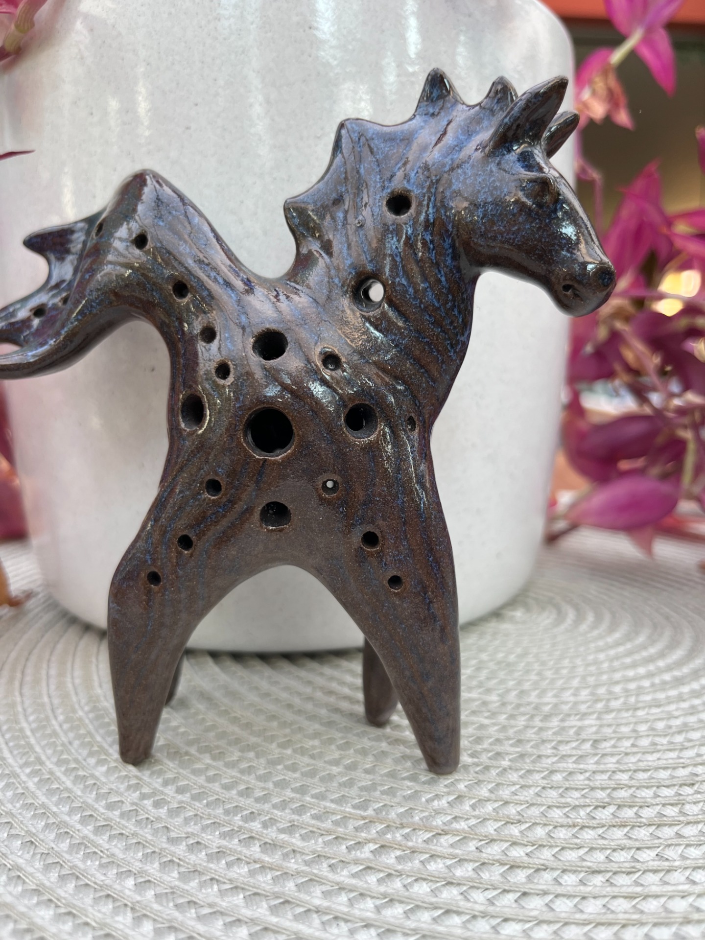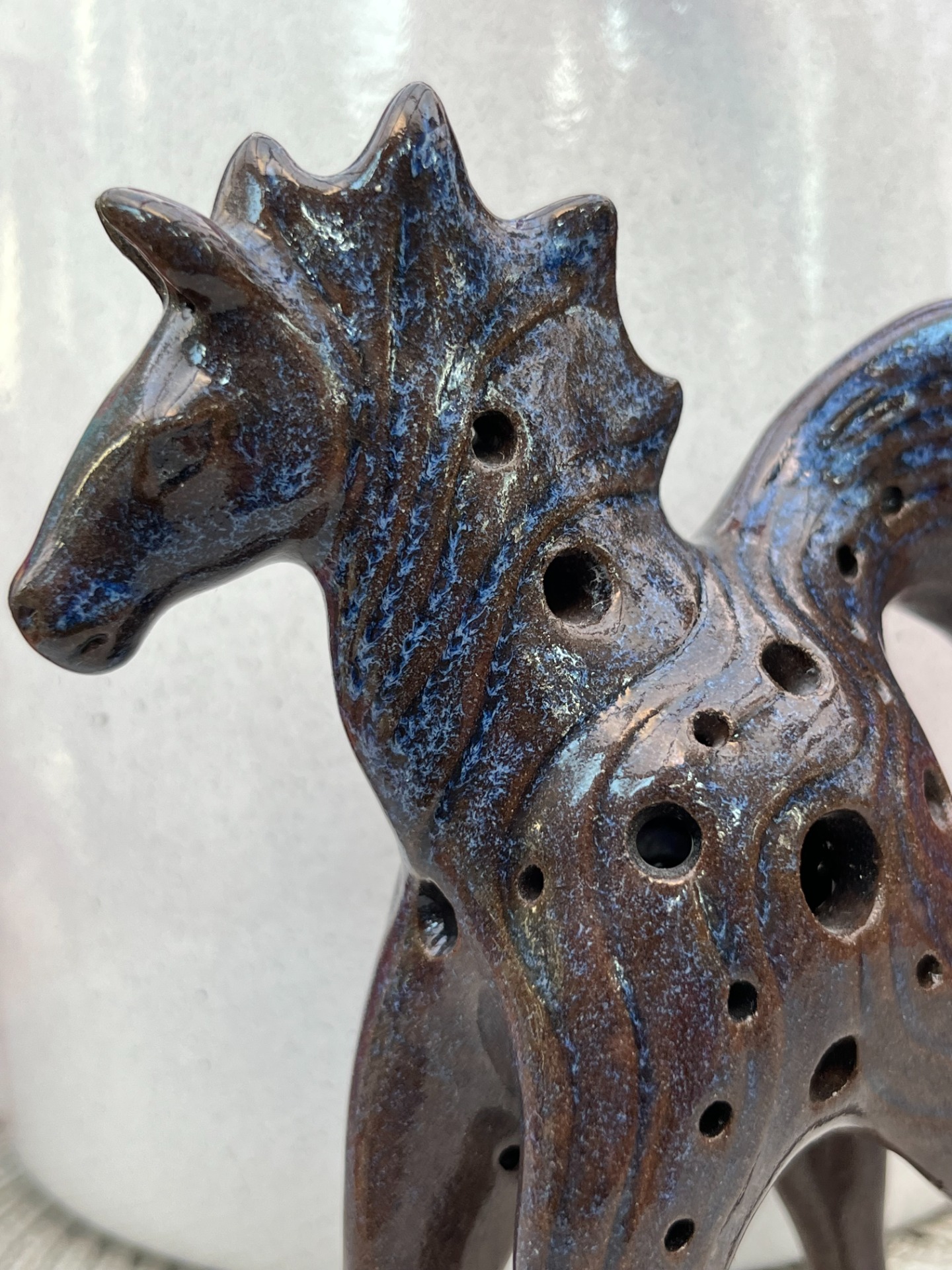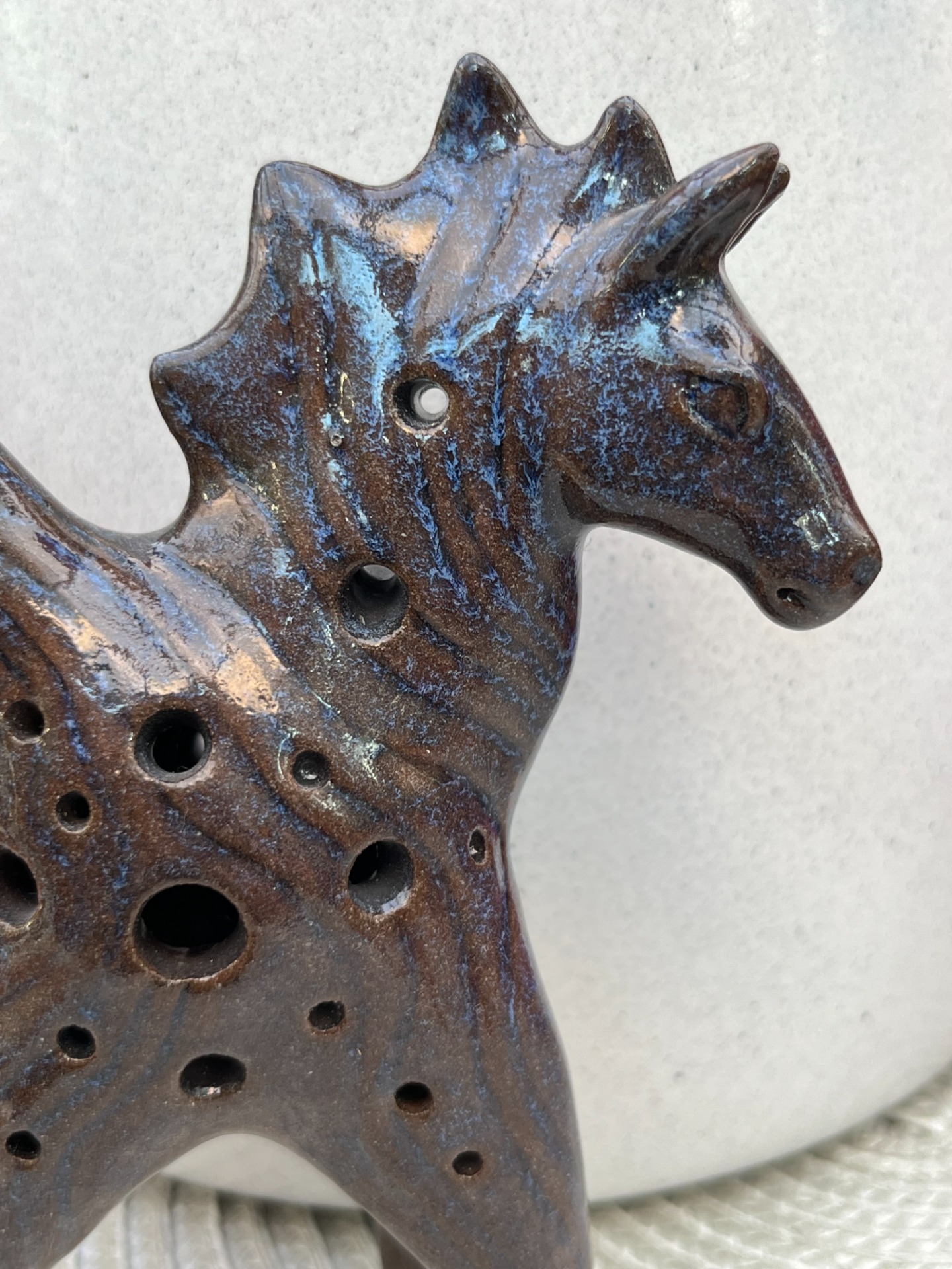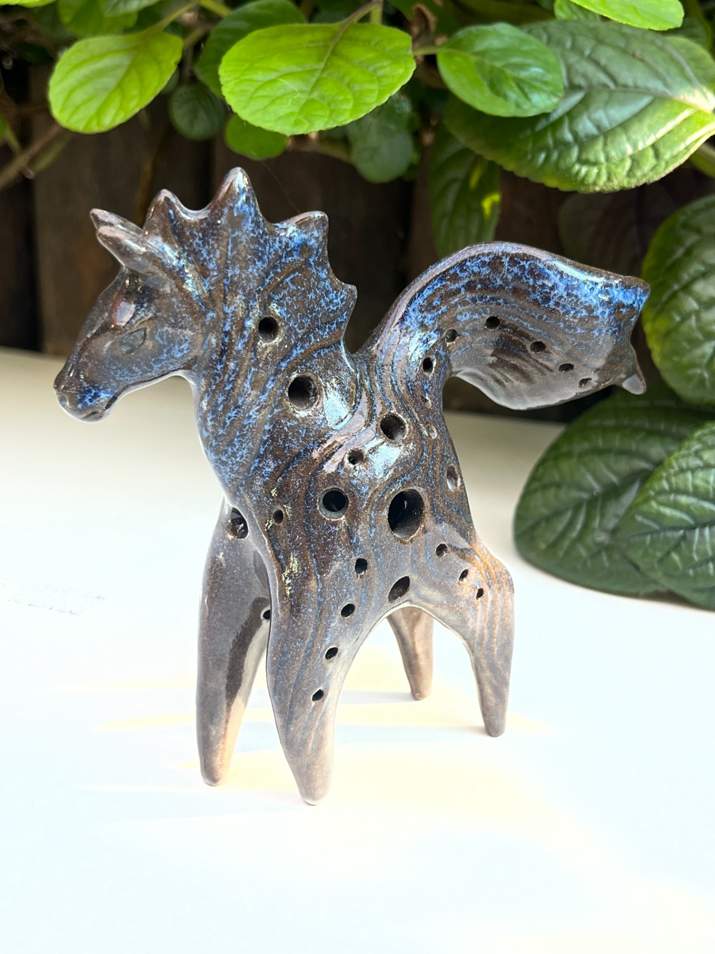 Malá, vymazlená, dutá figurka bájného koníčka ve stylizovaném pojetí, z tmavé burelové hlíny, dekorovaná reliéfem a pokrytá transparentní glazurou s magickým nádechem. V-13cm.