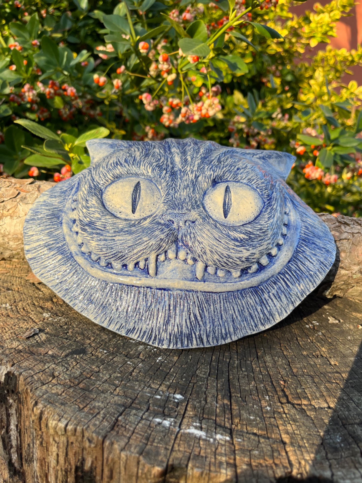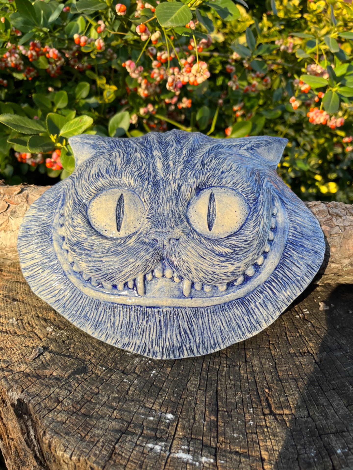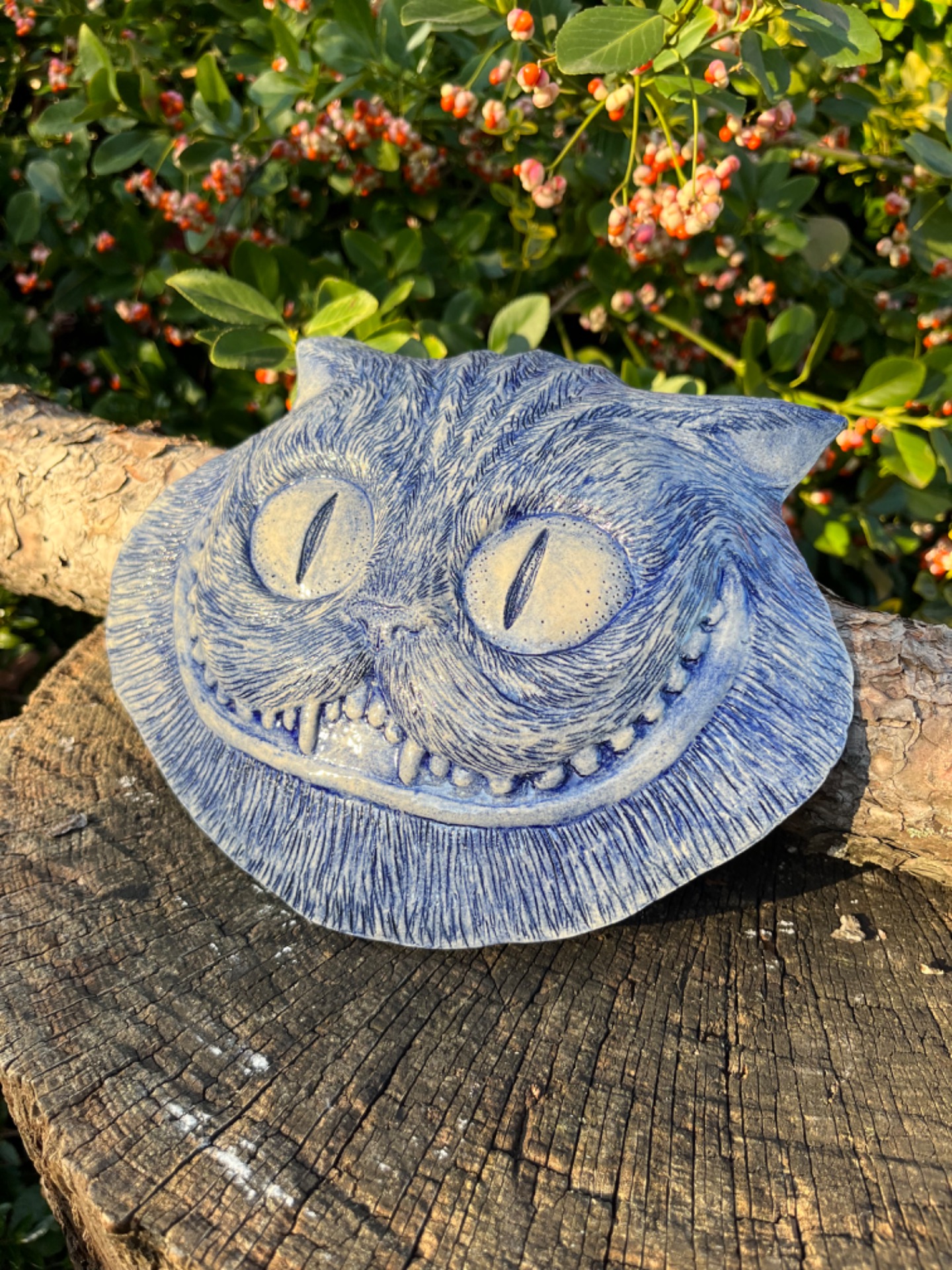 Znáte ji? Tu neustále proměnlivou bytost jejíž hlava se vznáší a vlní ve vzduchu? Závěsný porcelánový reliéf na motiv kočky Šklíby inspirovaný Alenkou z říše divů. Mrazuvzdorný, vhodný do interiéru i exteriéru. v-18cm, š-23cm.