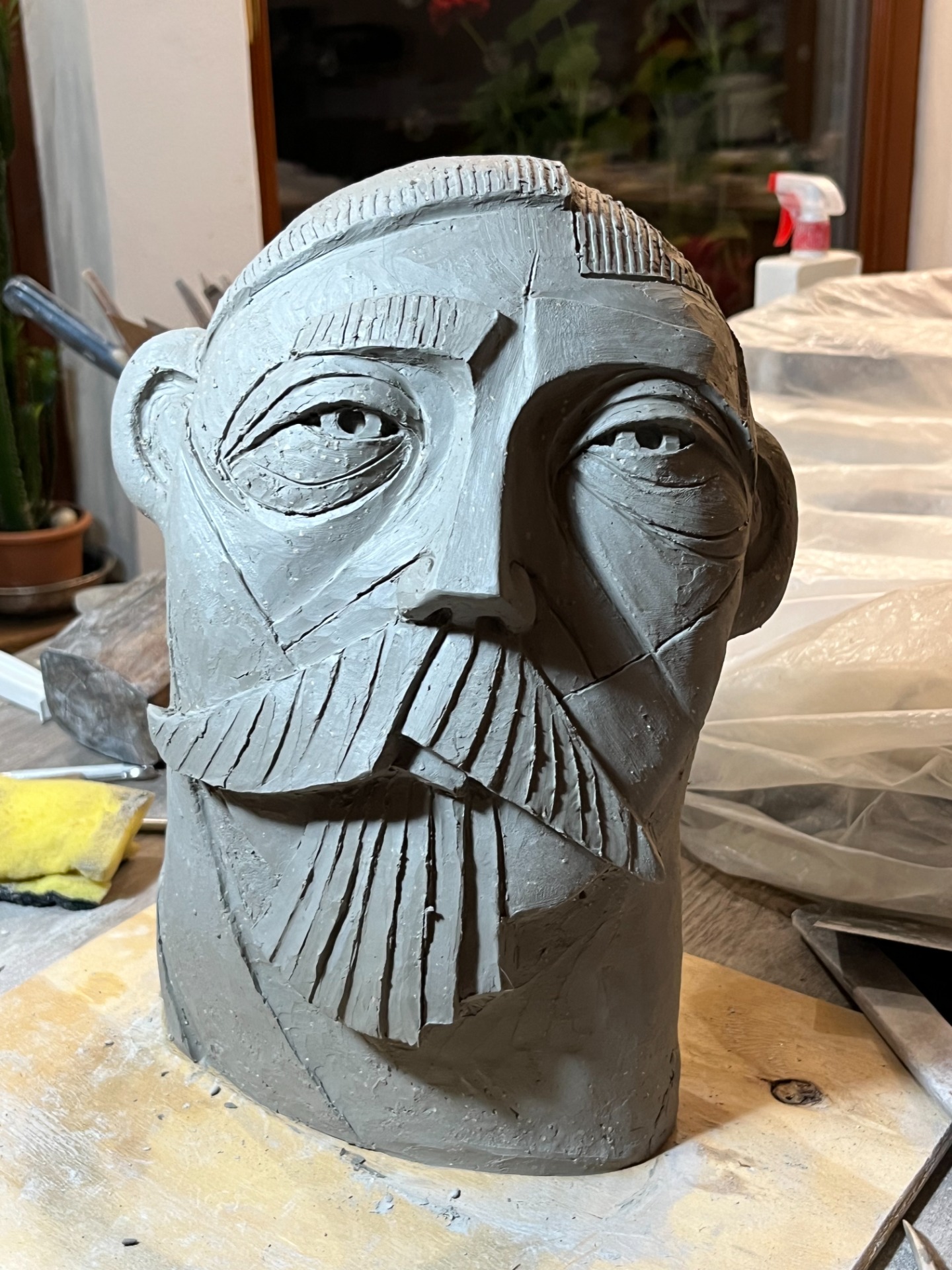Z masivního plátu kameniny vytvoříme hrubou siluetu hlavy, kterou následně dotváříme do stylizované podoby. Vaše dílko lze dekorovat barevnými engobami či oxidy. Poté vám výrobek usuším, vypálím, naglazuji transparentní glazurou a opět vypálím.