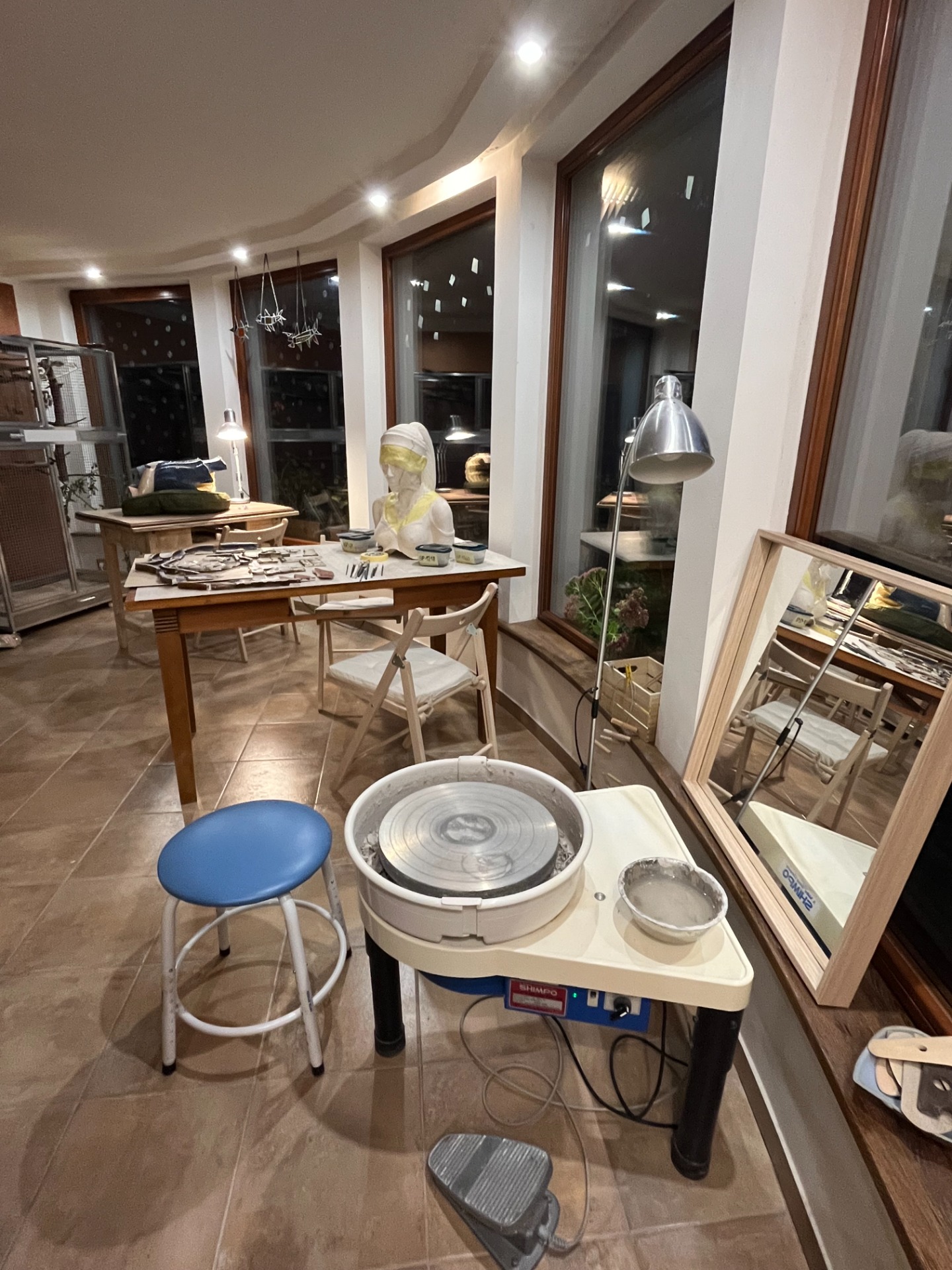 Točení na hrnčířském kruhu. Tento kurz je určen všem, začátečníkům i pokročilým a dětem od 12 let. Jste-li úplní začátečníci, naučíte se, jak správně zpracovat a připravit hlínu, základní postupy centrování a tažení hlíny. Pokročilí mohou zdokonalovat to, co již umí. Zjistíte-li, že tato činnost vám přináší uspokojení a radost, či touhu posunout se v řemesle dále, můžeme se domluvit na pravidelném točení, při kterém si osvojíte techniku a budete se vypracovávat v řemesle dále. Pakliže dostane vaše snaha konkrétní tvar, můžeme se učit dále a to obtáčení, uchacení, dekorování výrobku.