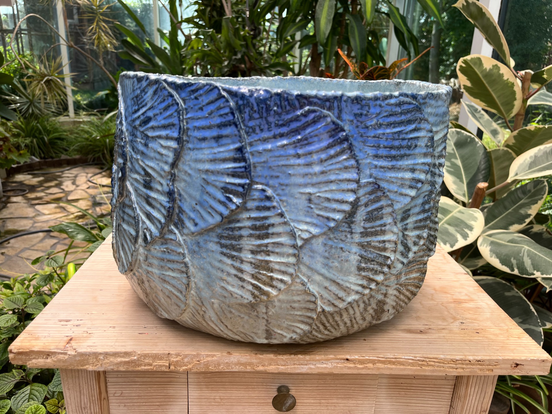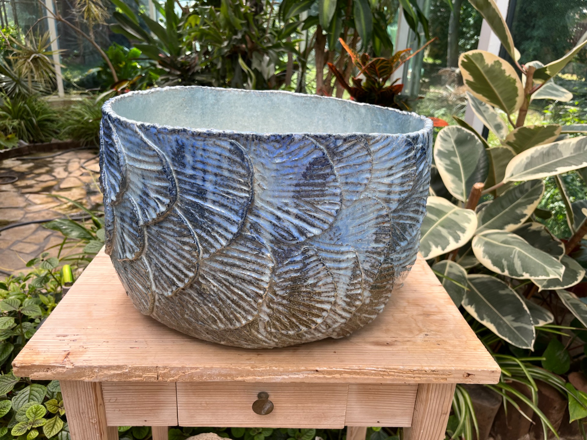 Modelovaný květináč velkých rozměrů z kameniny, reliéfní dekor v odstínech modré. Organický tvar do oválu. Mrazuvzdorný, vhodný do exteriéru i interiéru. Průměr 40cm, výška 25cm