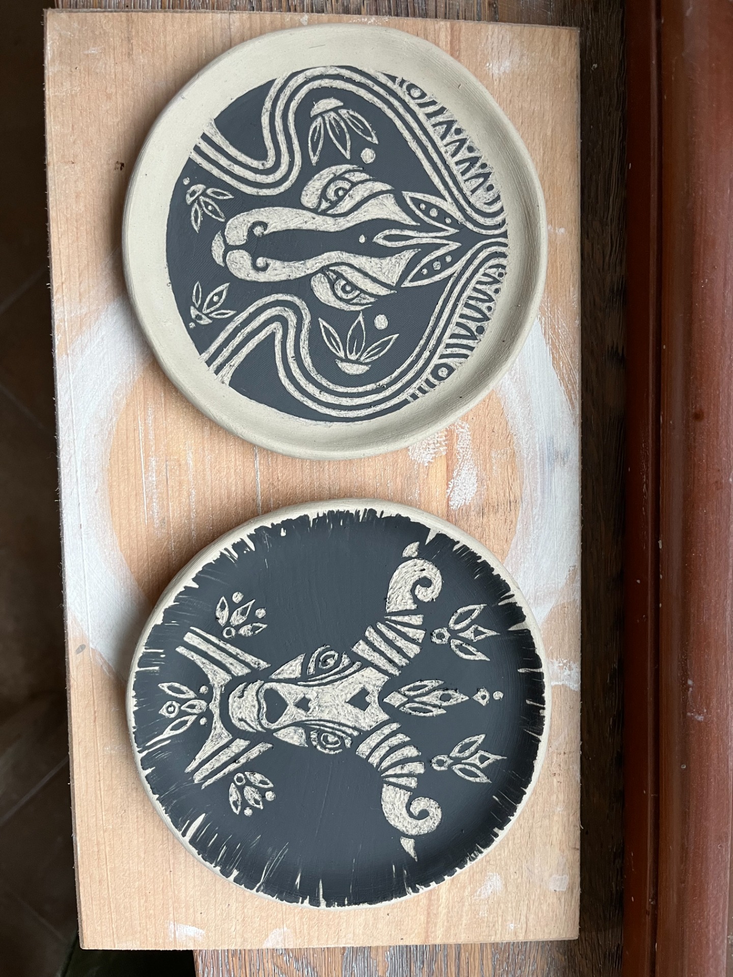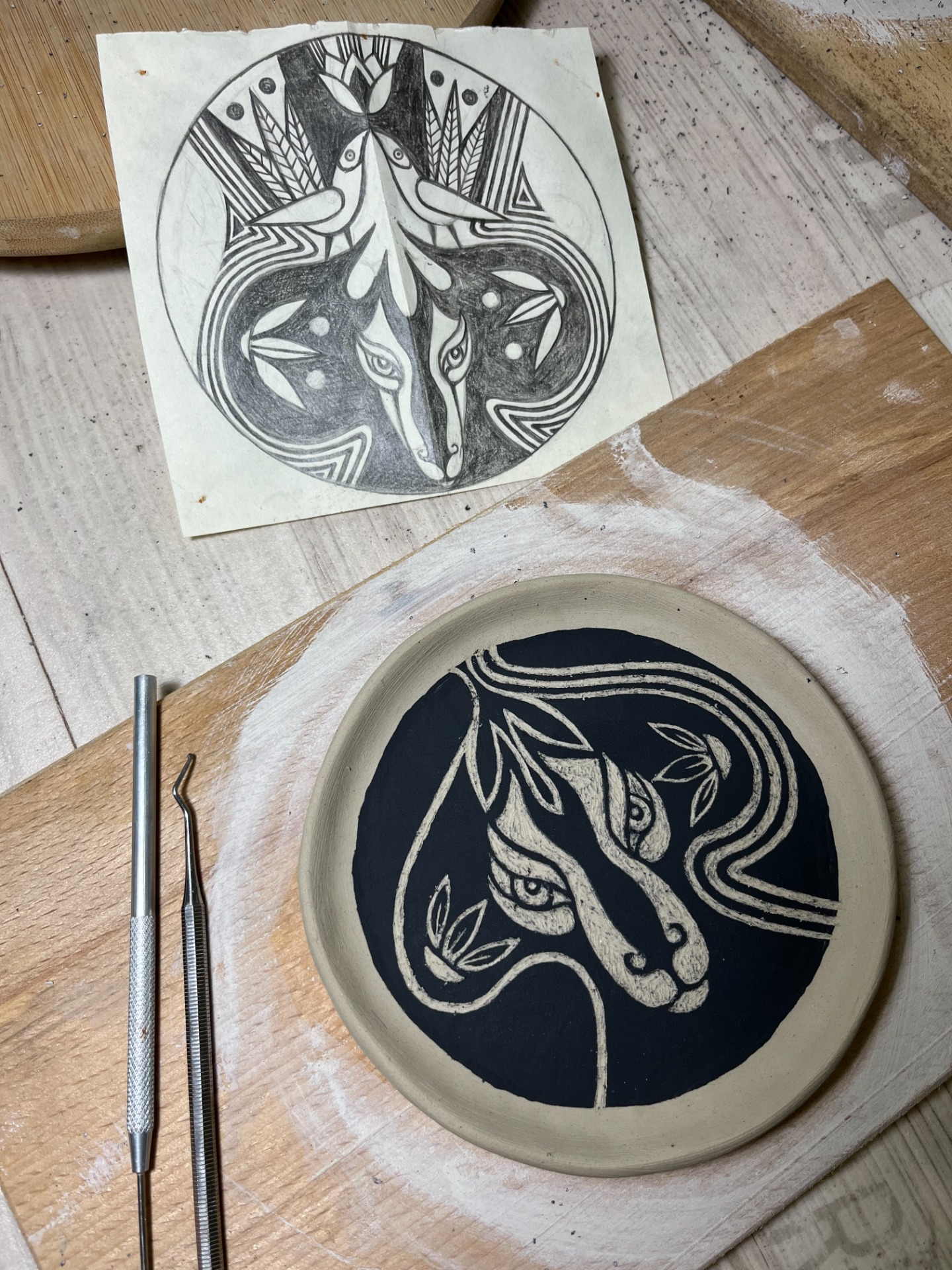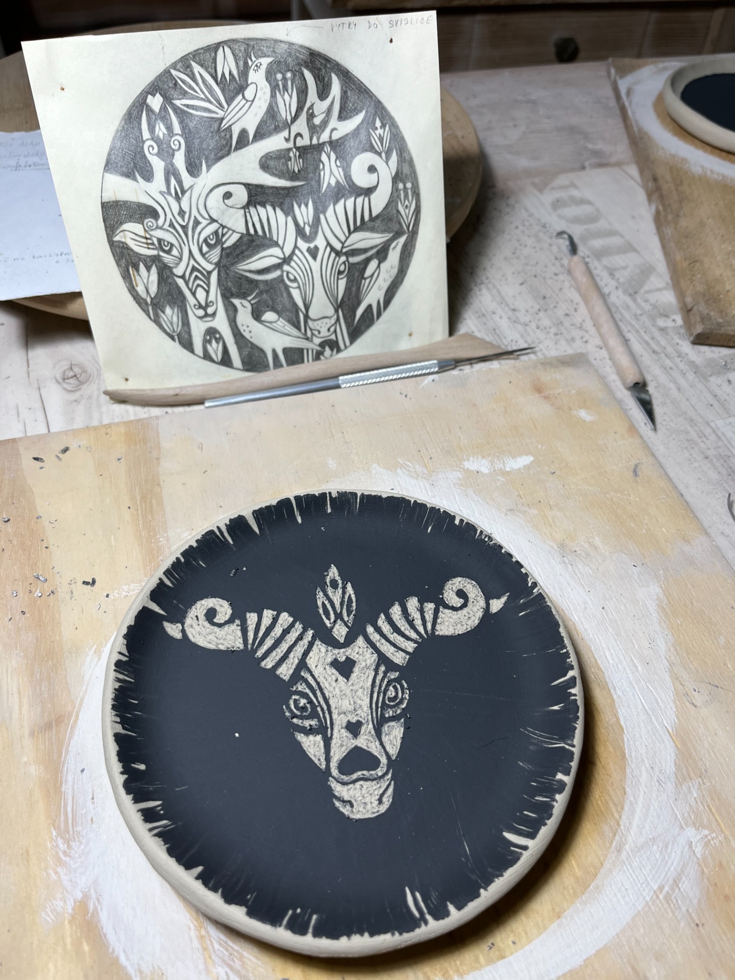 Z plátů a nebo pomocí formy si vytvoříme misku, tác či hrníček, či celý set dle vašich schopností. Na určitá místa naneseme jednobarevnou engobou, či kombinaci s více barvami. Do zavadlého povrchu vyškrábeme dekor, dle předloh a nebo podle vaší fantazie. Výrobek vám poté 2x vypálím a naglazuji průhlednou glazurou.