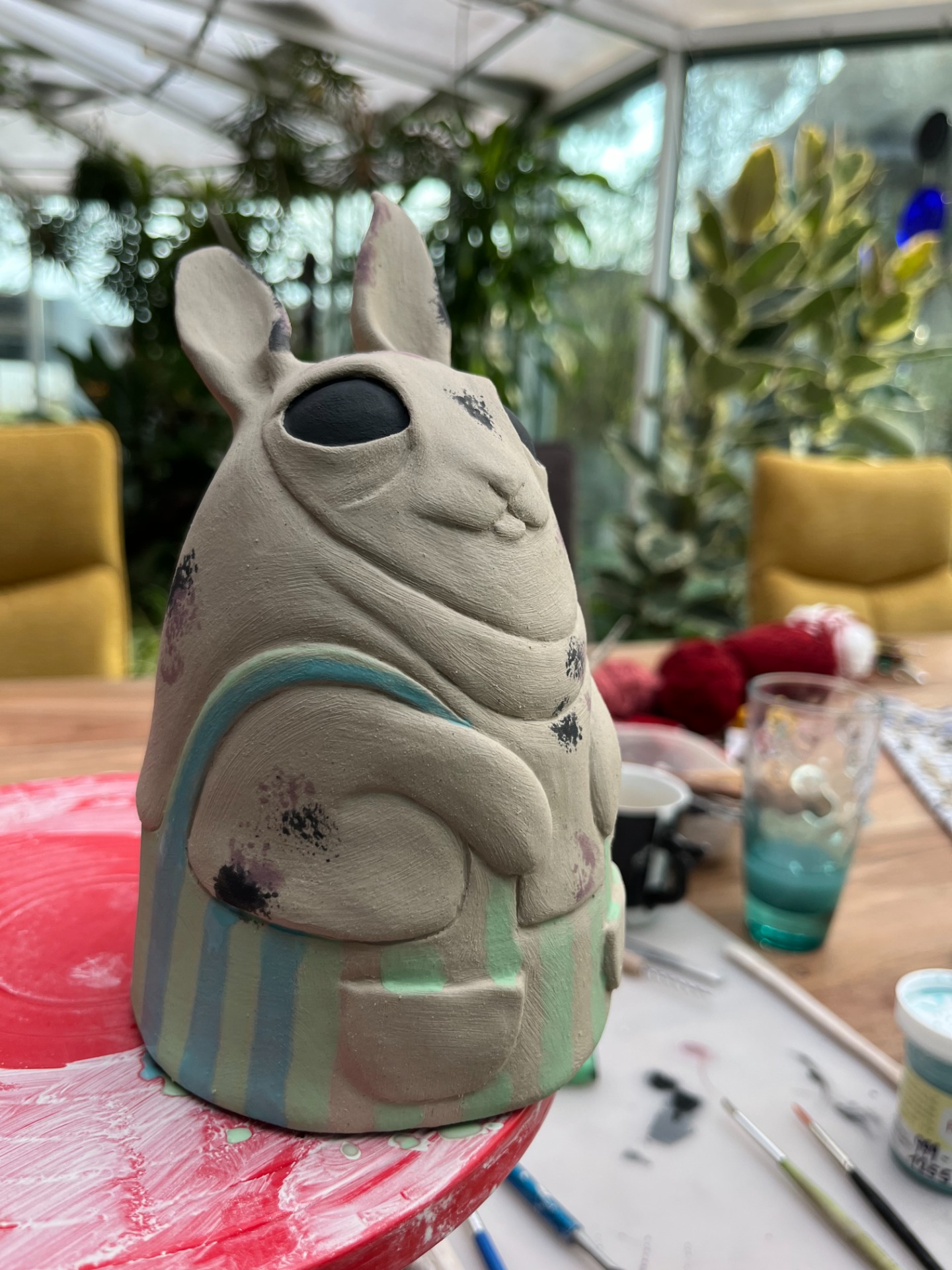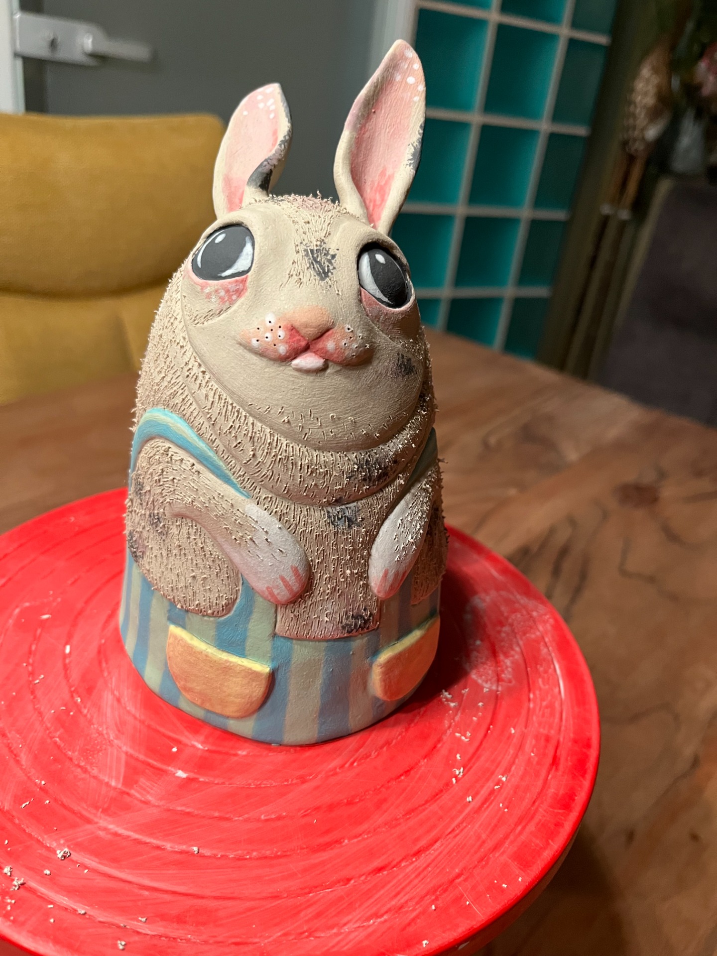 Na sádrové kopyto vytvarujeme z porcelánové hmoty kužel, který dále dotváříme do podoby jakéhokoli zvířátka, či bytosti. Poté ze zadní strany rozřízneme, sejmeme z kopyta a zase slepíme a zaretušujeme. Následně zdobíme pomocí štětce či houbičky barevnými engobami, popřípadě ještě proryjeme dekor. Výrobek vám usuším, vypálím, naglazuji transparentní glazurou. Zavěsím do zvonečku korálek, aby zvoneček dostal zvuk. Takovýto výrobek bude mrazuvzdorný a může ozdobit jak interiér, tak exteriér.