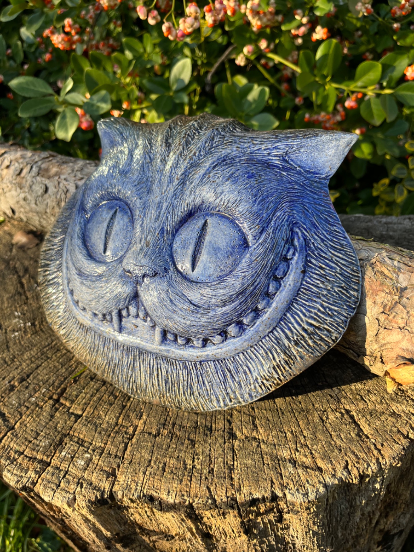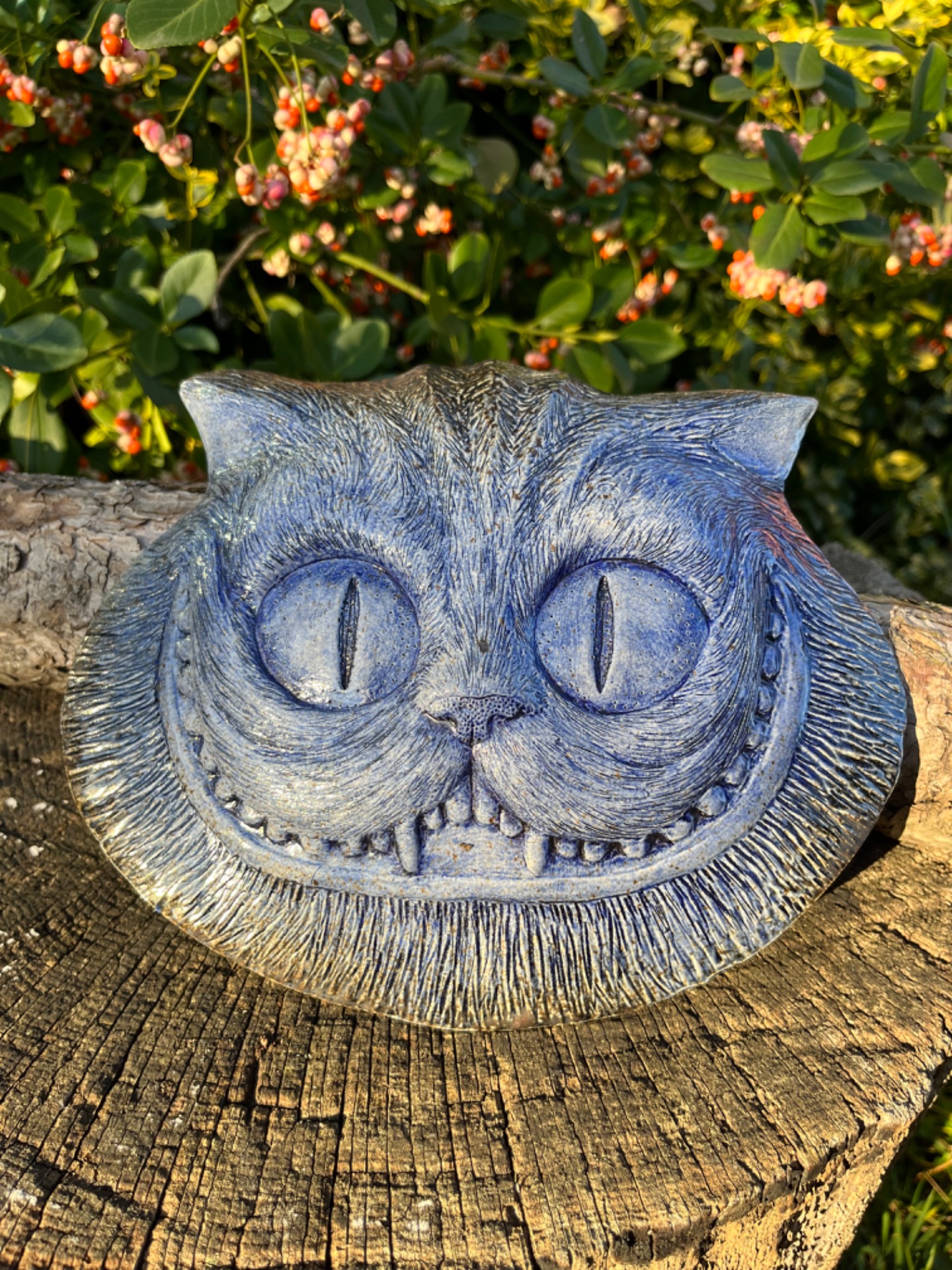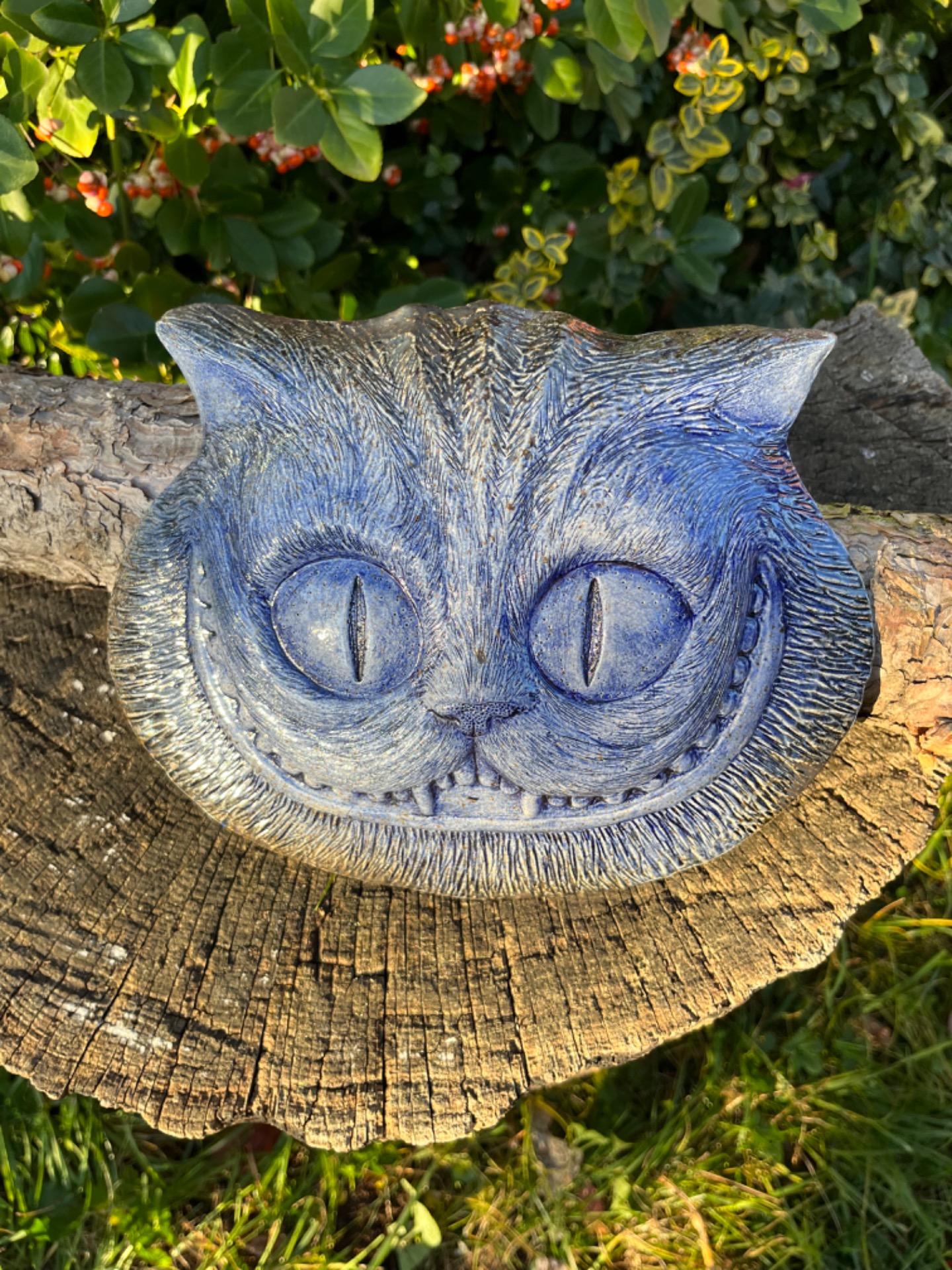 Znáte ji? Tu neustále proměnlivou bytost jejíž hlava se vznáší a vlní ve vzduchu? Závěsný porcelánový reliéf na motiv kočky Šklíby inspirovaný Alenkou z říše divů. Mrazuvzdorný, vhodný do interiéru i exteriéru. v-18cm, š-23cm.