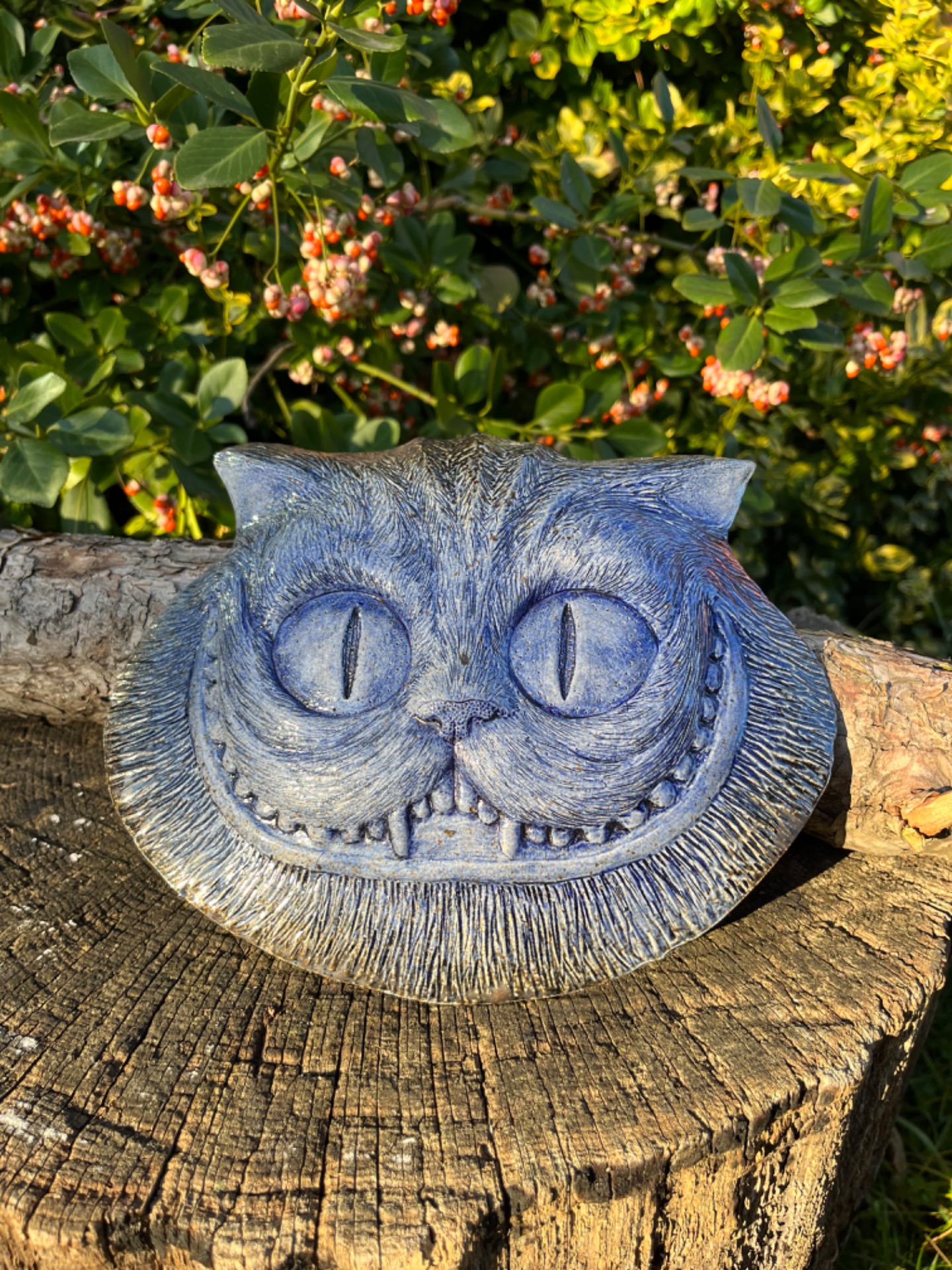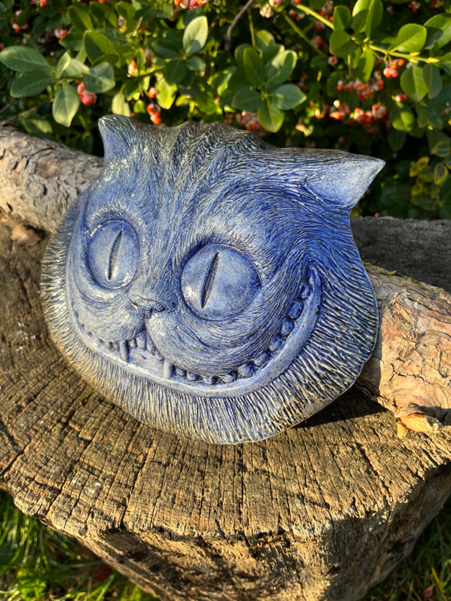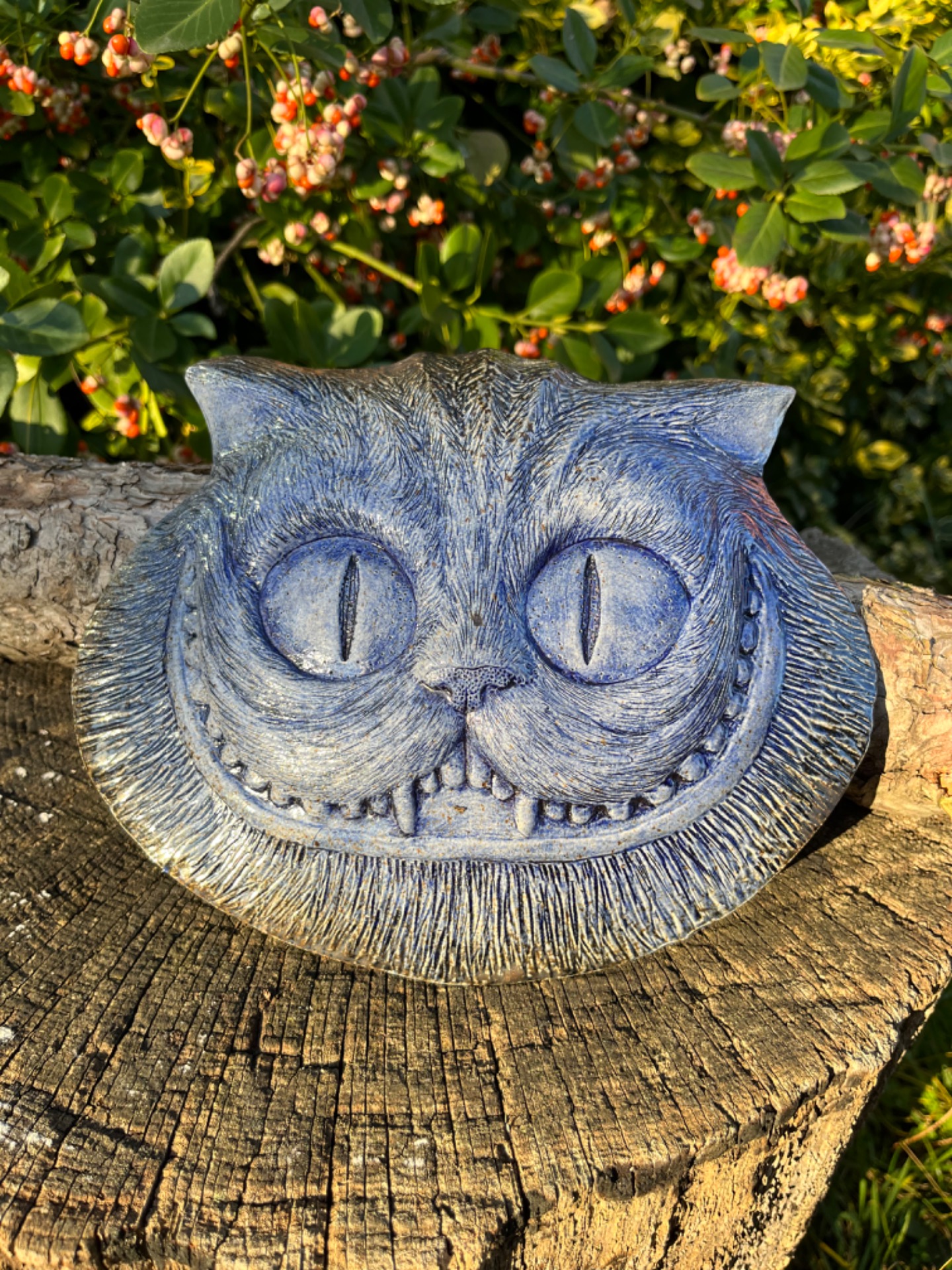 Znáte ji? Tu neustále proměnlivou bytost jejíž hlava se vznáší a vlní ve vzduchu? Závěsný porcelánový reliéf na motiv kočky Šklíby inspirovaný Alenkou z říše divů. Mrazuvzdorný, vhodný do interiéru i exteriéru. v-18cm, š-23cm.