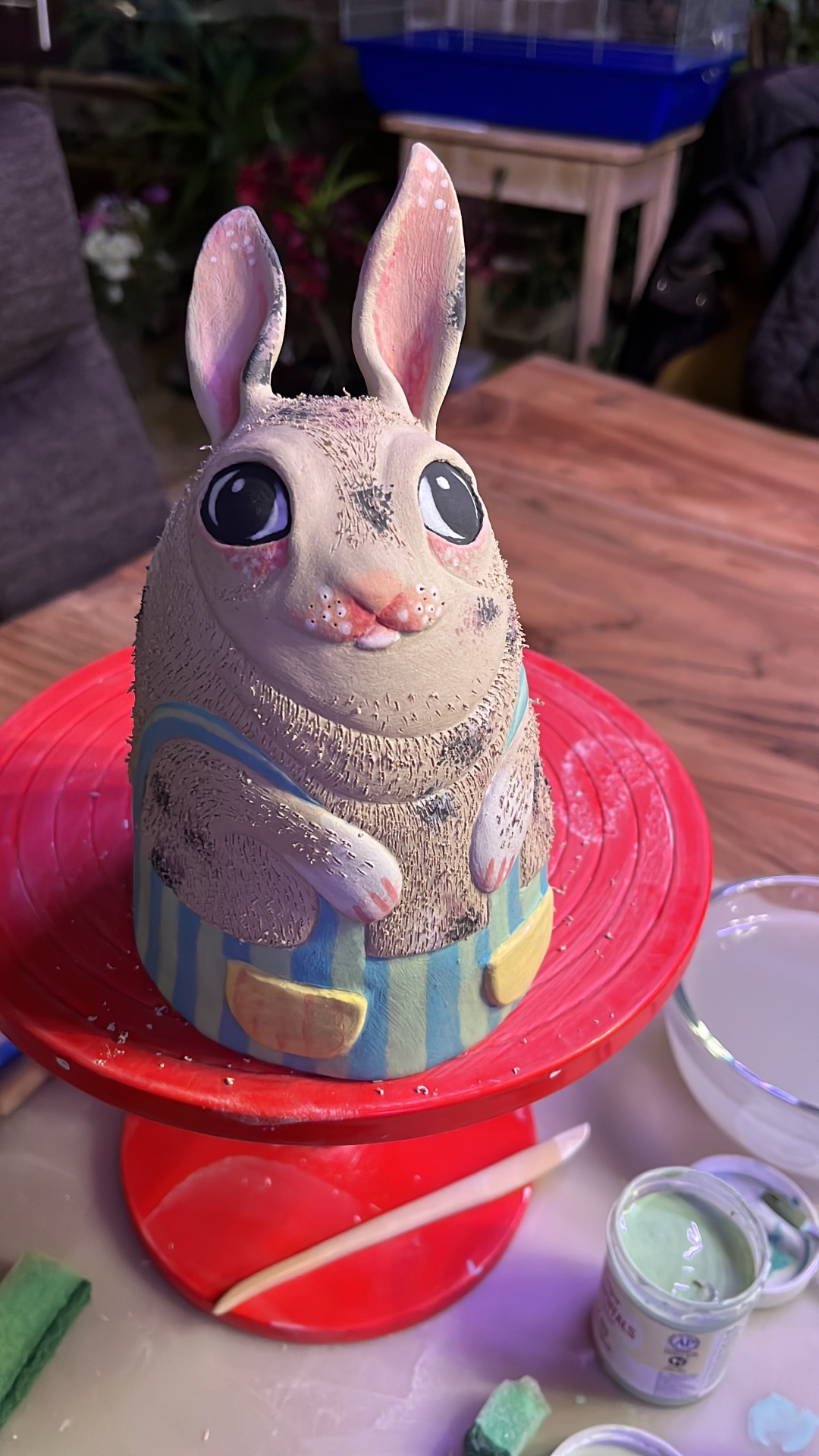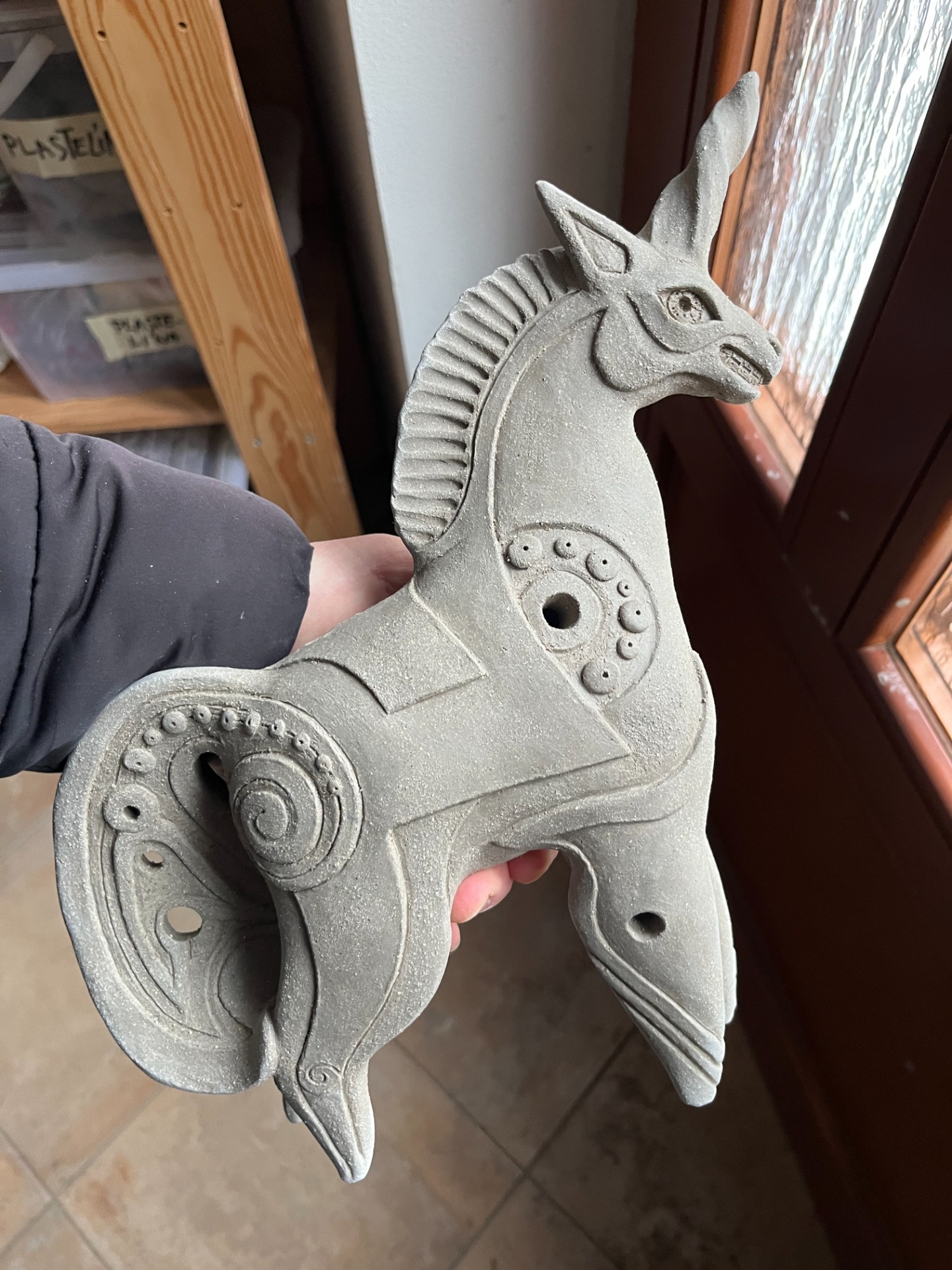 Vymodelujeme si figurku zvířátka dle předlohy a nebo své fantazie. Upravíme pro výpal- tzn. tlusté části jako např. tělíčko vydutíme. Zaretušujeme, následně povrchově plasticky dekorujeme. Naneseme jednu a nebo více barev engoby a proškrábneme dekor. Můžeme zapatinovat i oxidy, vše vám na místě vysvětlím a pomohu vám. Poté se výrobek asi 14dní opatrně suší, dále projde přežahem- výpal na 900 stupňú. Pak jej naglazuji transparentní glazurou a pálím na vysoký výpal dle druhu keramické hlíny. K vyzvednutí bude opět na mlýně a nebo v atelieru v Odolene Vodě, popřípadě zašlu poštou.